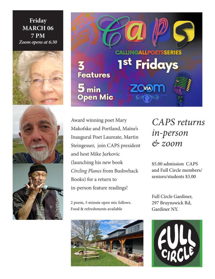 After a three year hiatus from in-person readings and due to strong demand to go live, CAPS First Friday 3/6/26 features Ulster County Poet Laureate Mike Jurkovic (launching his new collection - Circling Planes) and award winning poets Mary Makofske and Portland, Maine's inaugural Poet Laureate, Martin Steingesser. Mike, Mary, and Martin will each be reading for 20-23 minutes with a 2 poem/5 minute open mic to follow. Both food & refreshments are available at Full Circle's onsite bakery and restaurant!